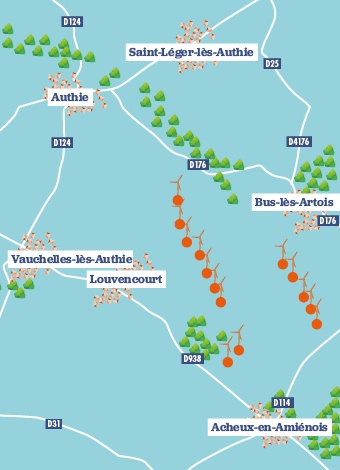 Mis en service en 2018, le parc éolien du Coquelicot 1 est situé entre les communes de Bus-lès-Artois, Acheux-en-Amiénois et Louvencourt, dans la Somme.