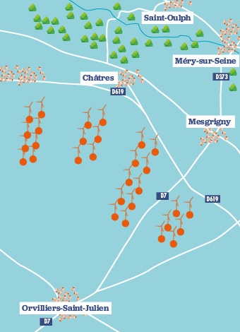 Mis en service en 2015, le parc éolien Seine Rive Nord est situé entre les communes de Châtres, Mesgrigny, Orvilliers-Saint-Julien et Vallant-Saint-Georges, dans l’Aube. Le parc est composé de 30 éoliennes Nordex N100 d’une hauteur de 150m en bout de pale. Les éoliennes approvisionnent en électricité (consommation hors chauffage) l’équivalent de 75 000 foyers/an.